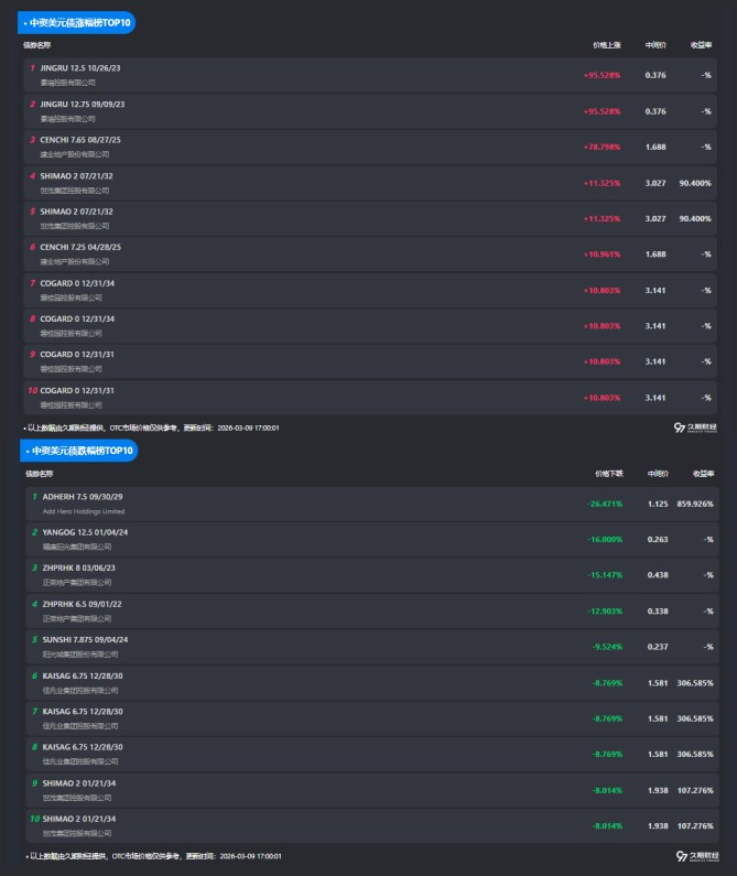 3月9日,中资好意思元债涨跌幅榜TOP10如下: