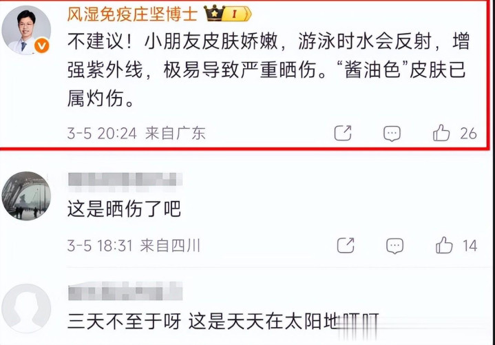 可是,随着磋磨的深切,越来越多的大夫和育儿博主的留言开动“画风突变”,迫切指示相继而至,这种进度的晒黑,确切不是骄贵的本钱,而是赤裸裸的健康风险!