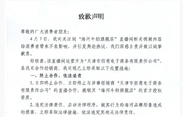 4月8日凌晨,天津海河乳品有限公司发布致歉声明,其谐和运营商运营的“海河牛奶旗舰店”直播间出现性示意黑话、瞻念看成及低俗表述,不服公序良俗。海河乳品晓喻断绝与该运营商谐和,并对里面监管问题张开拜谒。