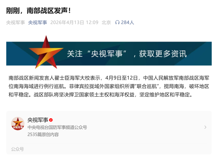 南部战区发布通报正告菲好意思澳三方,立即罢手在南海的军事寻衅,战区队伍将常态保持严防,照章依规处理一切侵权看成。