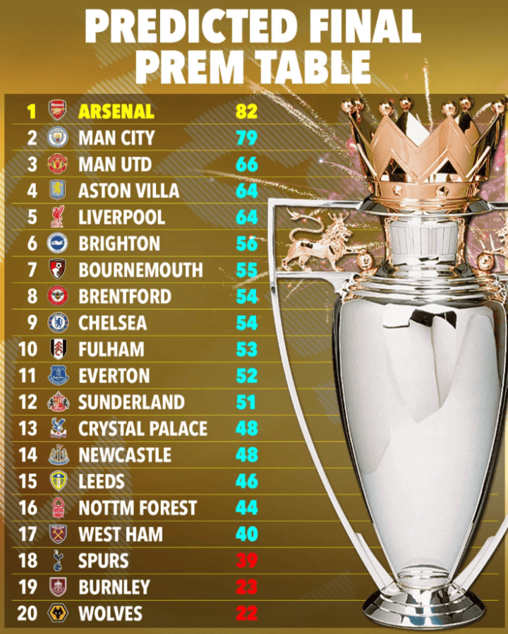 超等贪图机还预测,阿森纳和曼城,在剩余比赛中齐不会赢得全胜。阿森纳临了4轮预测赢得3胜1负,最终积82分;曼城还剩5轮联赛,但预测将输掉其中2场,最终积79分。