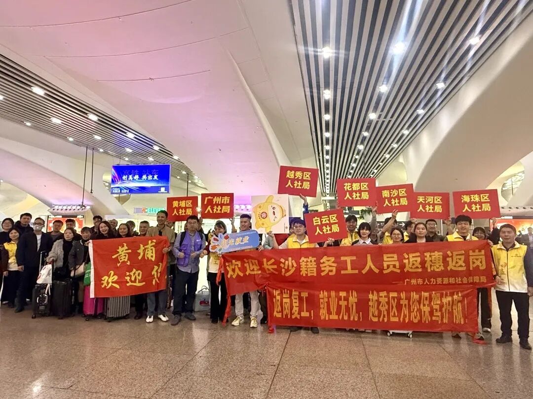 列车停稳,车门开启,拎着大包小包的务工东说念主员鱼贯而出。广州市东说念主社部门的责任主说念主员举着红色横幅,为返岗东说念主员奉上来自花城的第一缕缓和。