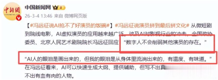 他说演员到临了拼的照旧文化,还说AI画的眼泪莫得温度,演员的眼泪才是真的,这话一下子就火了。