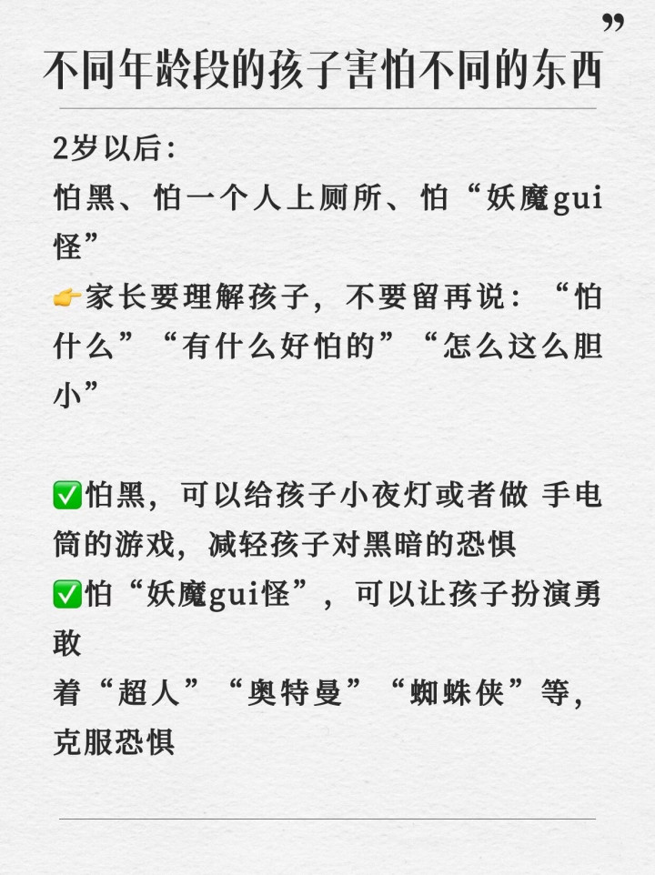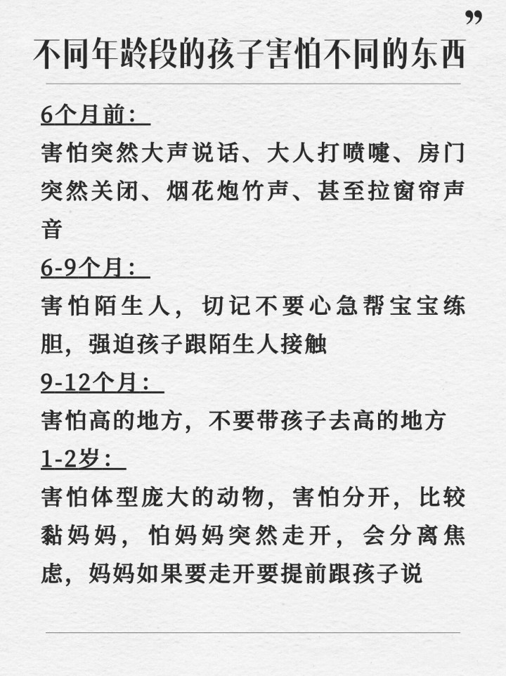2-4岁:发怵具体的事物,如怕黑、怕某种动物、怕杂音。讲话材干增强,大要抒发懦弱了。