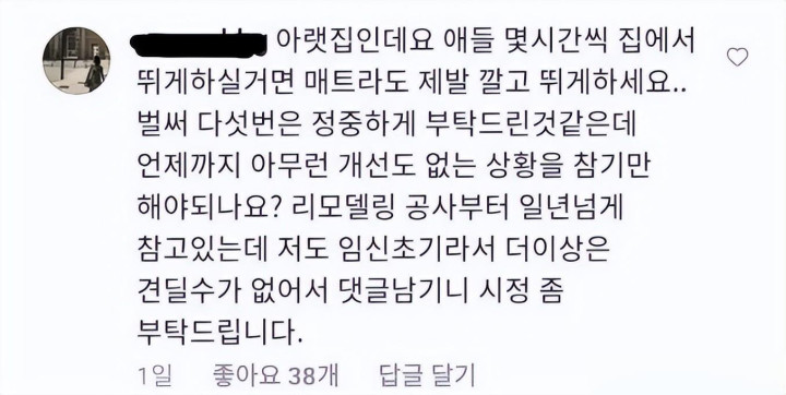 邻居留言称:“既然楼下住了东说念主,还念念要让孩子在家跑好几个小时,那就请铺个垫子再跑吧!照旧防范交付了5次,然而莫得任何改善,我究竟要忍到什么时候呢?从校正工程驱动照旧忍了一年多,我亦然怀胎初期,简直再也忍不明晰!”