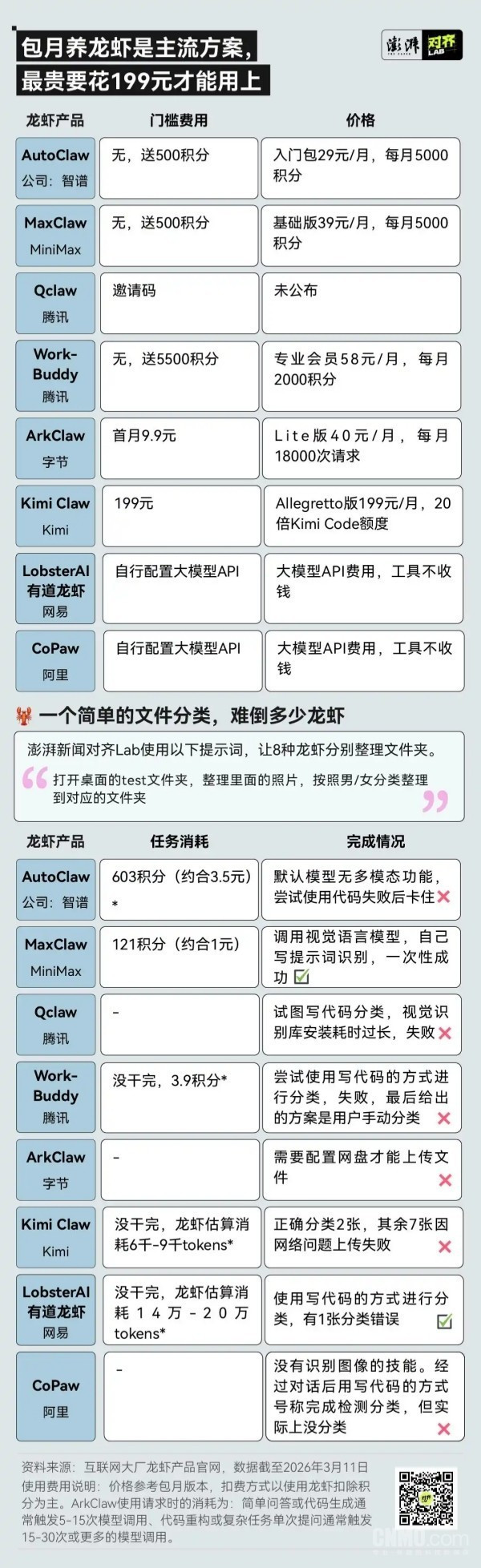 [CNMO科技音书]3月12日,《滂沱新闻》对王人Lab在奏效设立开源版OpenClaw的基础上,齐集一个月的“养虾”心得,对互联网大厂的8款类OpenClaw居品进行了测评。概述来看,大厂版“龙虾”缩小了让平凡东说念主用敕令行设立“养虾”环境的硬核门槛,但距离所谓的“一键装置”“零门槛上手”还有很大的差距。此外,“龙虾”的token破钞、安全性等问题也辞谢小视。