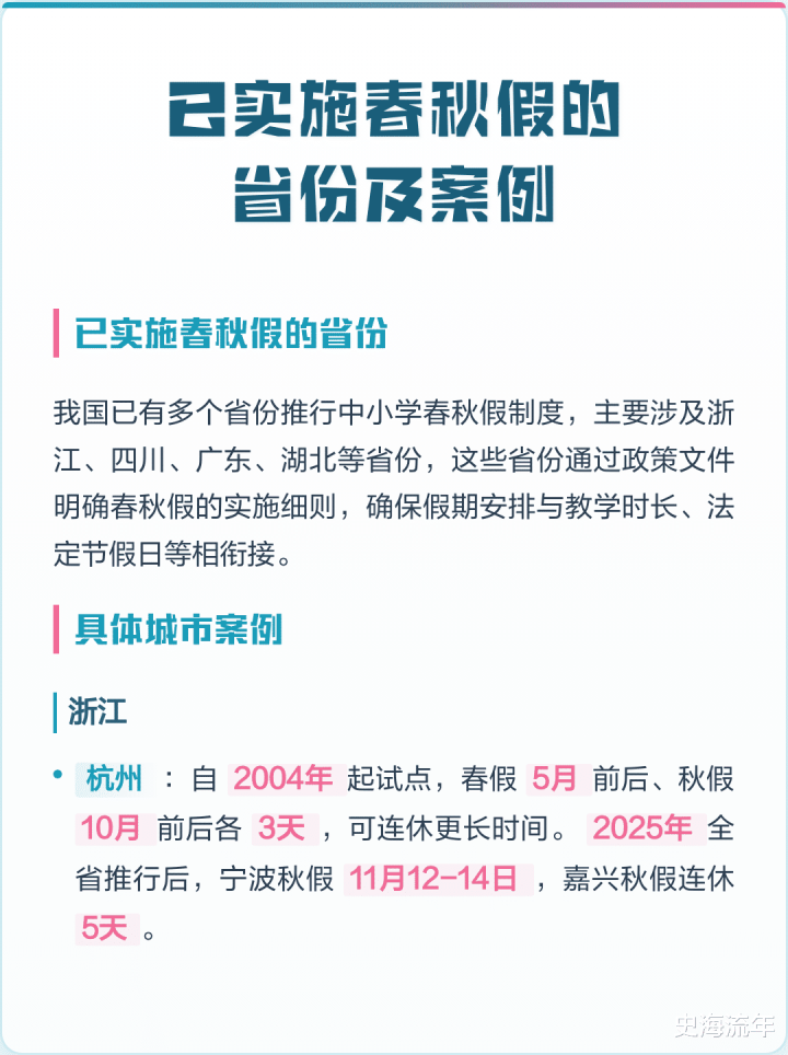 铁心当今,中小学春秋假仍是从试点探索走向全面推行,越来越多的省份与城市加入其中。浙江省走在宇宙前哨,成为首个全省边界内抓行中小学春秋假轨制的省份,十一个设区市一王人出台联系文献,数百万中小学生领先享受到这份西宾福利。